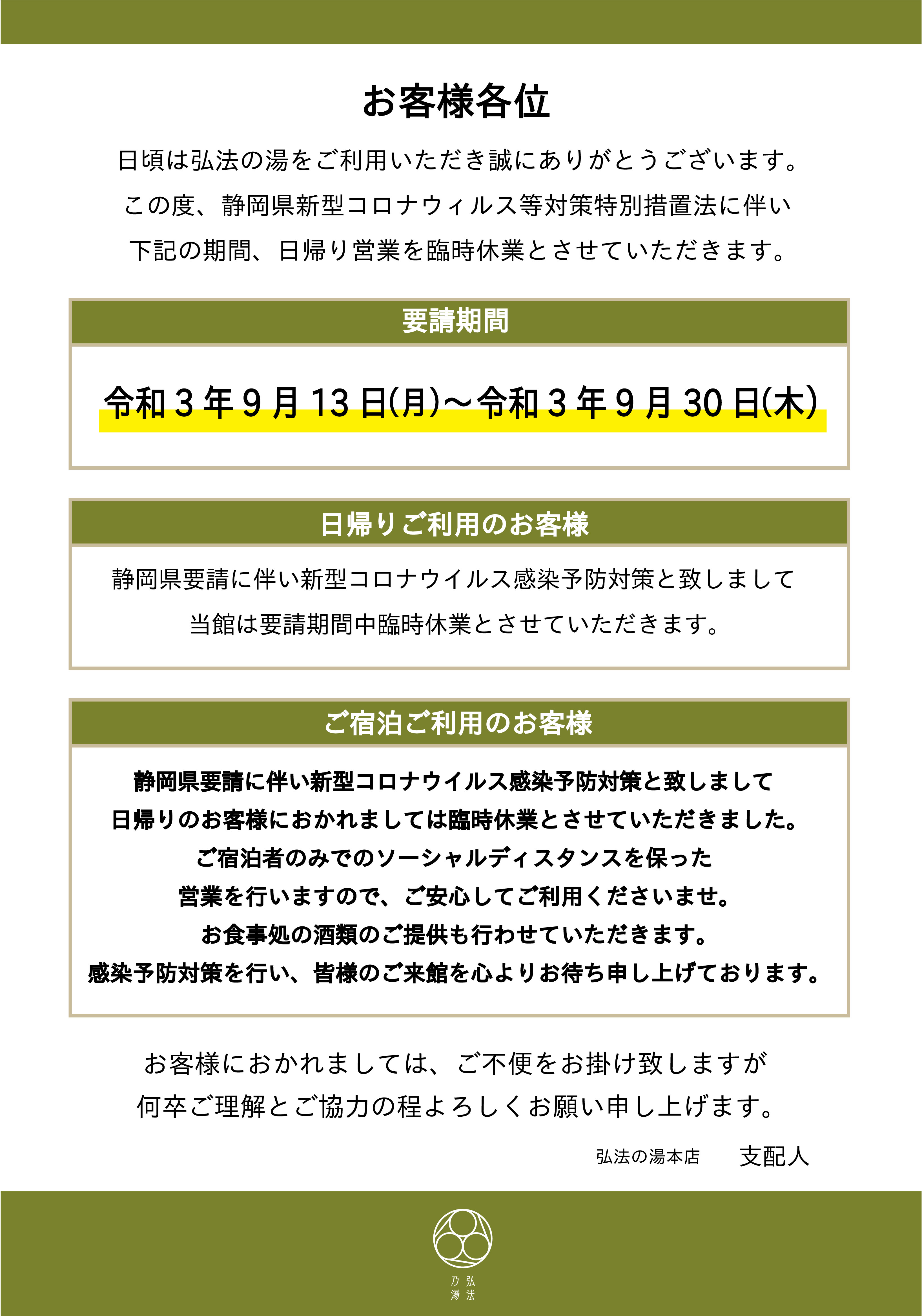 緊急事態宣言に伴い日帰り入浴営業のご案内。