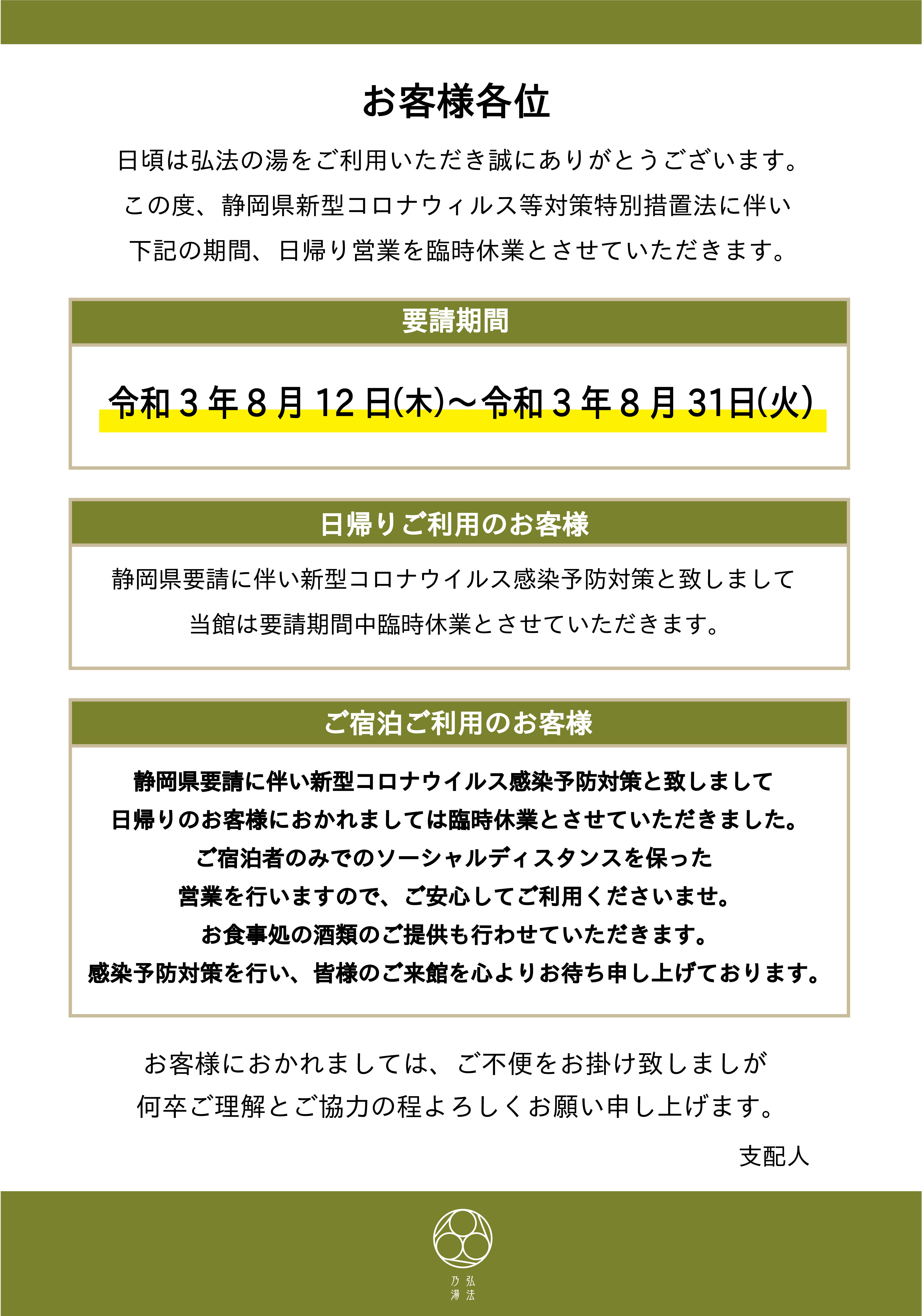緊急事態宣言に伴い日帰り入浴営業のご案内。