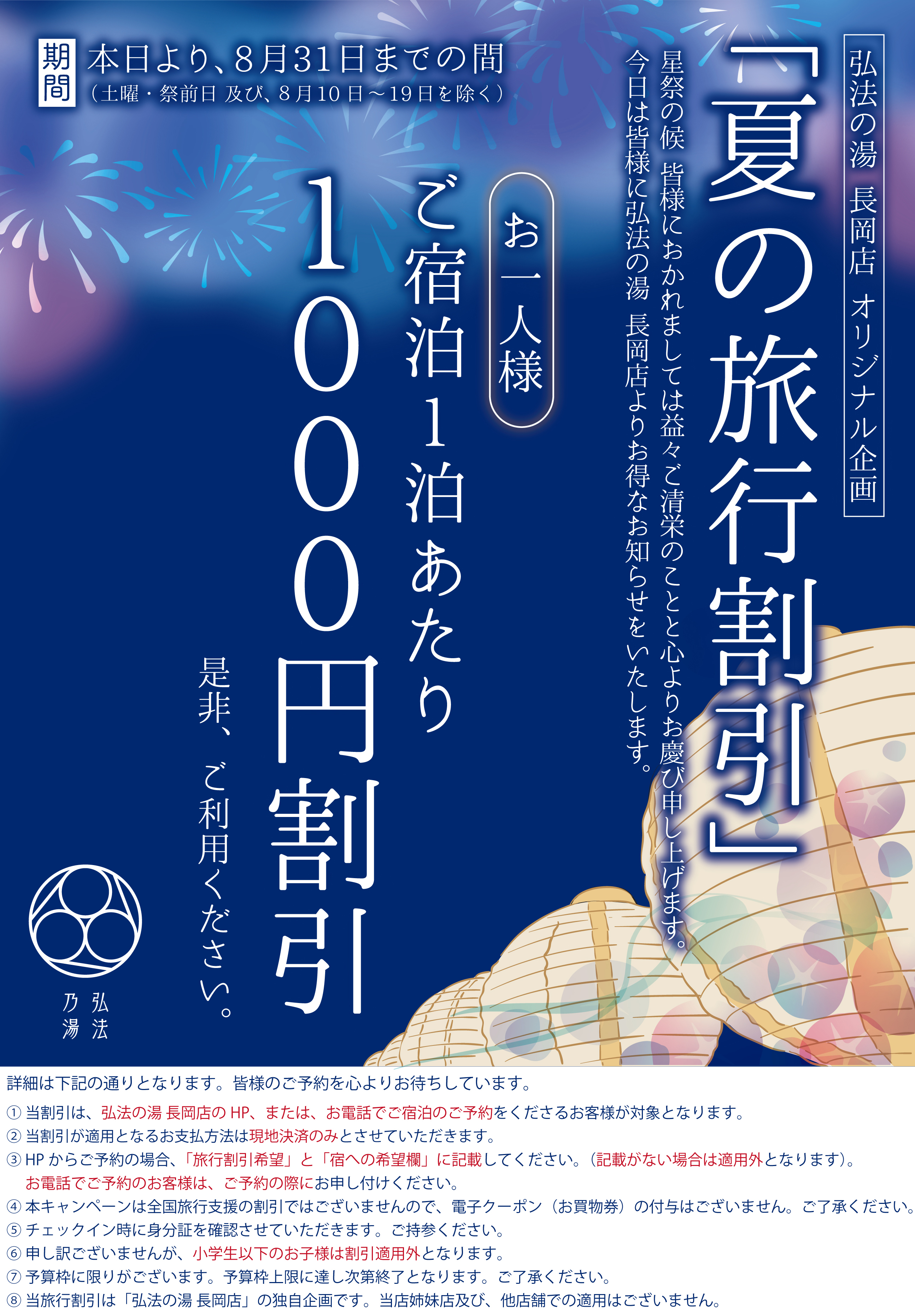 弘法の湯グループでは、直接の電話予約と自社ホームページからの予約につきましては、Go・Toトラベル対象外となります。