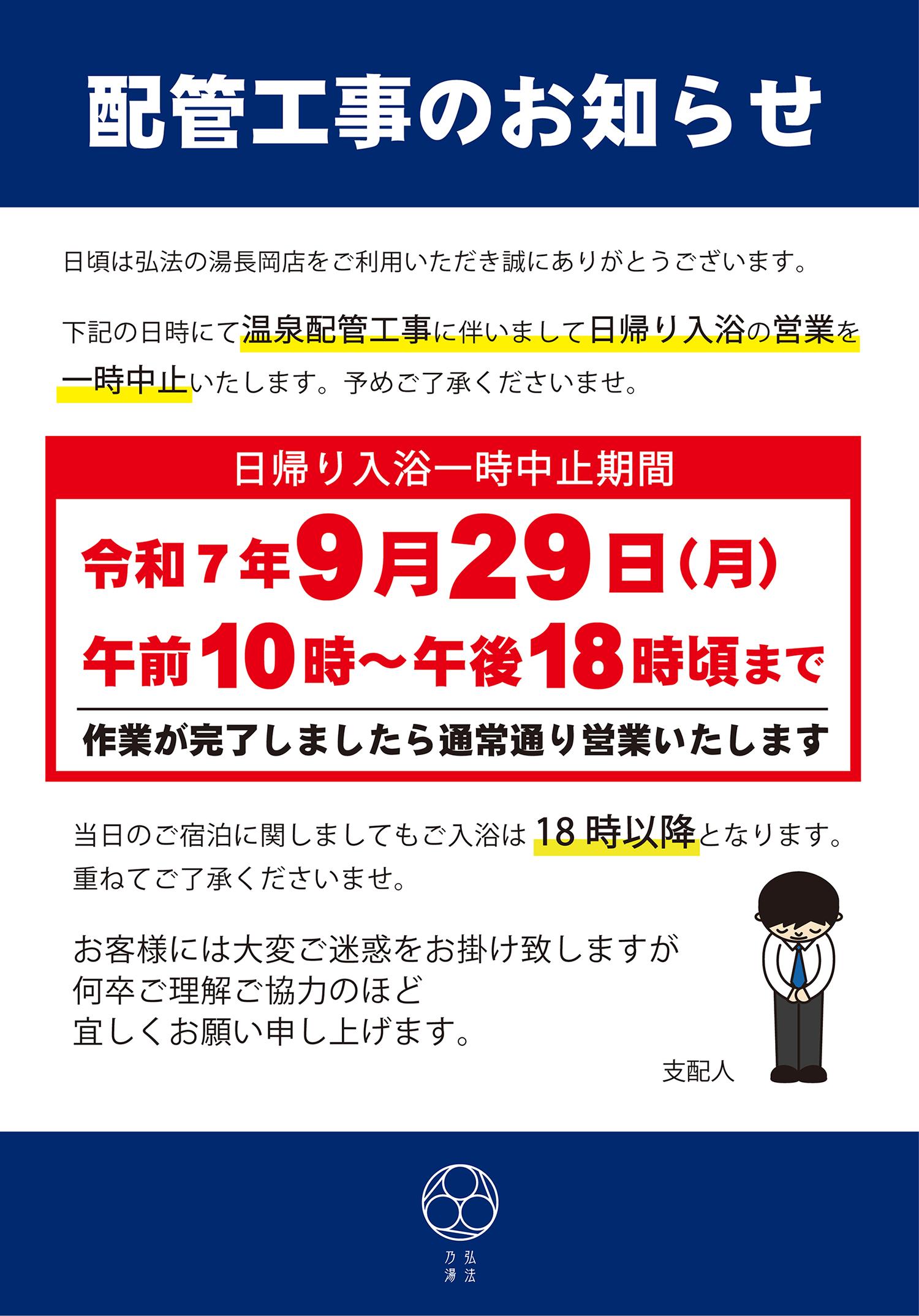 下記の日時にて温泉配管工事に伴いまして日帰り入浴の営業を一時中止いたします。予めご了承くださいませ。
