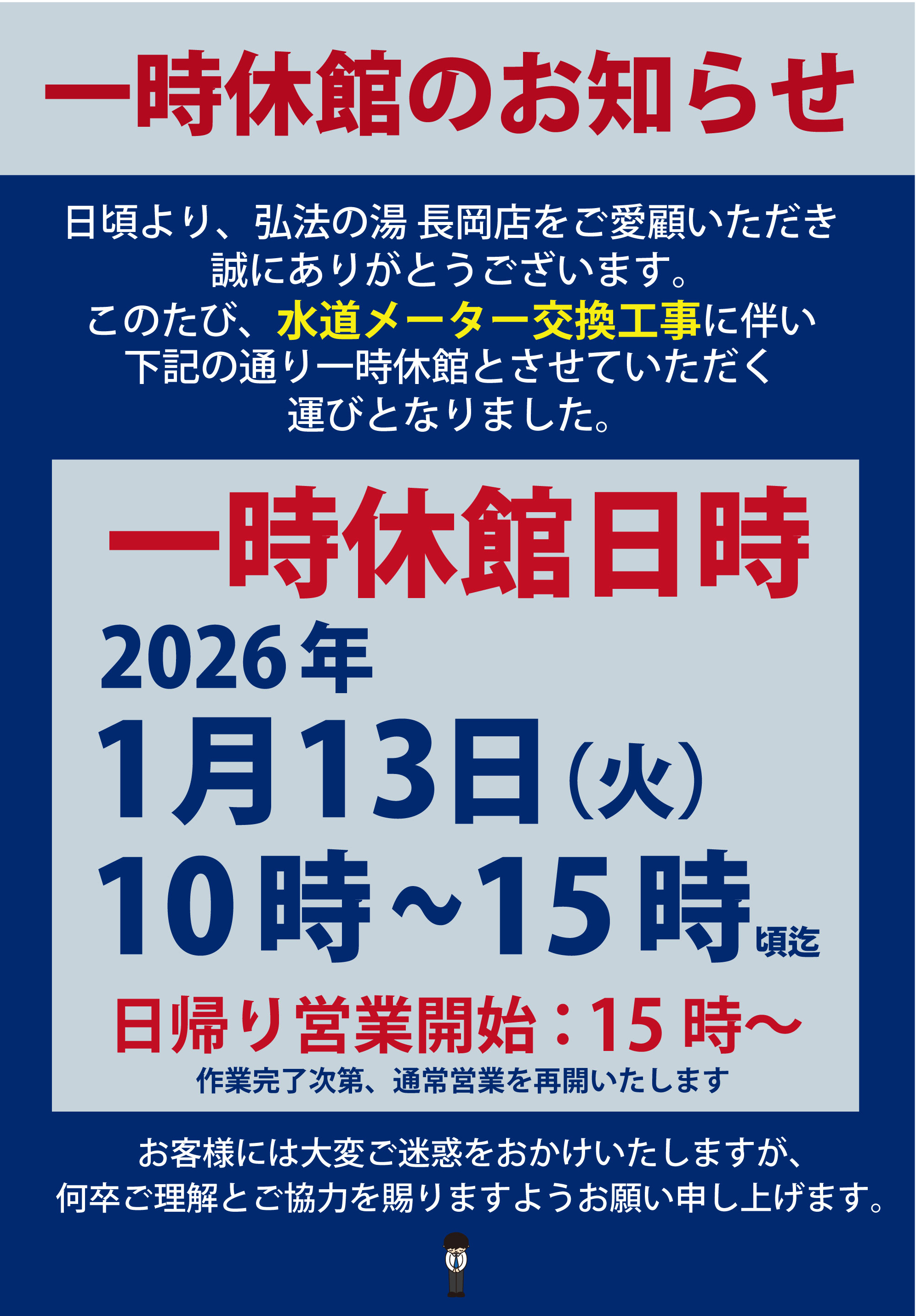 2026年1月13日に計器交換工事のため、10:00~15:00(終了予定)の間、(停電・断水)の為一時休館をいたします。日帰りをご利用のお客様は姉妹店の本店を是非ご利用くださいませ。12日よりご連泊のお客様はご注意くださいませ。ご迷惑をお掛け致しますが何卒、ご理解ご協力の程宜しくお願い申し上げます。