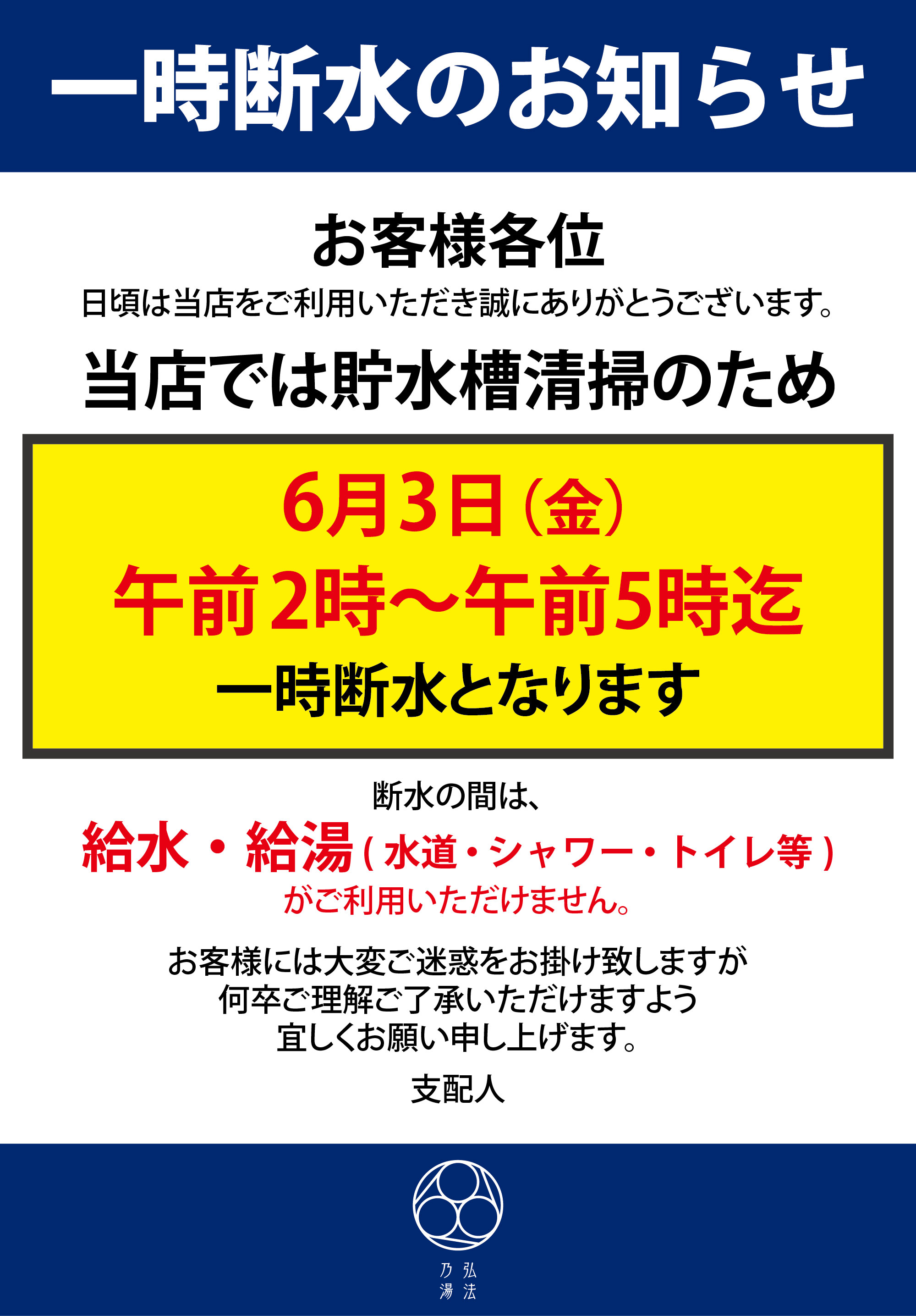 この度、当店では貯水槽清掃のため下記の時間帯にて給水・給湯